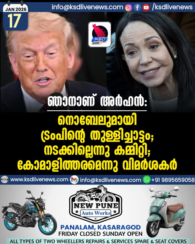 വാഷിങ്ടൻ: ‘പരസ്പര ബഹുമാനത്തിന്റെ മനോഹരമായ പ്രകടനം’ – വെനസ്വേല പ്രതിപക്ഷ നേതാവ് മരിയ കൊരീന മച്ചാഡോയ്ക്കു കിട്ടിയ സമാധാന നൊബേൽ പുരസ്കാരം അവർ തനിക്കു കൈമാറിയതിെപ്പറ്റി യുഎസ് പ്രസിഡന്റ് ഡോണൾഡ് ട്രംപിന്റെ പ്രതികരണം ഇങ്ങനെയായിരുന്നു. മച്ചാഡോ മാന്യയായ, മികച്ച വനിതയാണെന്നും ട്രംപ് കൂട്ടിച്ചേർത്തു. ഏറെക്കാലമായി ആഗ്രഹിക്കുന്ന സമാധാന നൊബേൽ കയ്യിൽക്കിട്ടിയതിന്റെ ആവേശം ട്രംപിന്റെ വാക്കുകളിലുണ്ടെങ്കിലും മറ്റൊരാൾക്കു കിട്ടിയ പുരസ്കാരം കൈക്കലാക്കി സന്തോഷിക്കുന്ന ട്രംപിനെതിരെ വിമർശനങ്ങളും പരിഹാസങ്ങളും ഉയരുന്നുണ്ട്. നൊബേൽ പുരസ്കാരം ഇത്തരത്തിൽ കൈമാറാനാവില്ലെന്നു പുരസ്കാര സമിതിയും വ്യക്തമാക്കിക്കഴിഞ്ഞു.