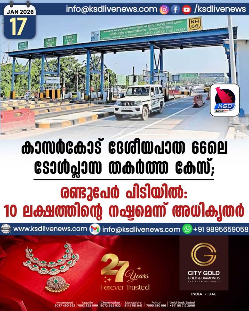 കാസർകോട് ദേശീയപാത 66ലെ ടോൾപ്ലാസ തകർത്ത കേസ്; രണ്ടുപേർ പിടിയിൽ: 10 ലക്ഷത്തിന്റെ നഷ്ടമെന്ന് അധികൃതർ