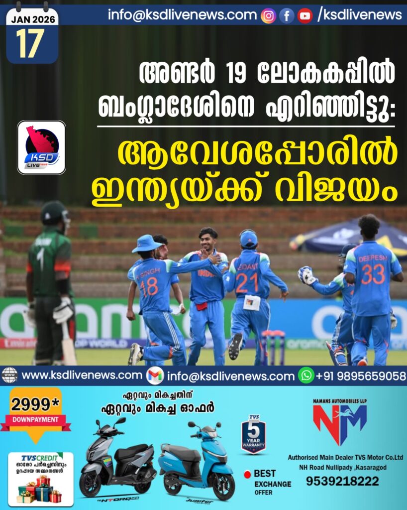അണ്ടര് 19 ലോകകപ്പില് ബംഗ്ലാദേശിനെ എറിഞ്ഞിട്ടു; ആവേശപ്പോരില് ഇന്ത്യയ്ക്ക് വിജയം