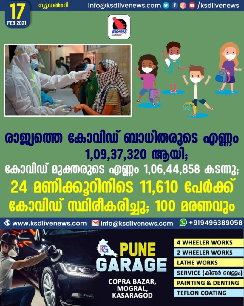 രാജ്യത്തെ കോവിഡ് ബാധിതരുടെ എണ്ണം 1,09,37,320 കടന്നു ; കോവിഡ് മുക്തരുടെ എണ്ണം 1,06,44,858 ആയി;