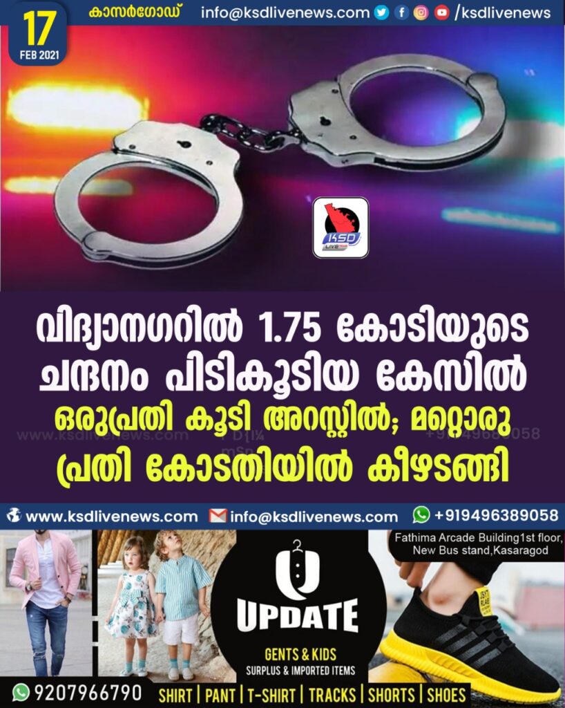 വിദ്യാനഗറില് 1.75 കോടിയുടെ ചന്ദനം പിടികൂടിയ കേസില് ഒരുപ്രതി കൂടി അറസ്റ്റില്; മറ്റൊരു പ്രതി കോടതിയില് കീഴടങ്ങി