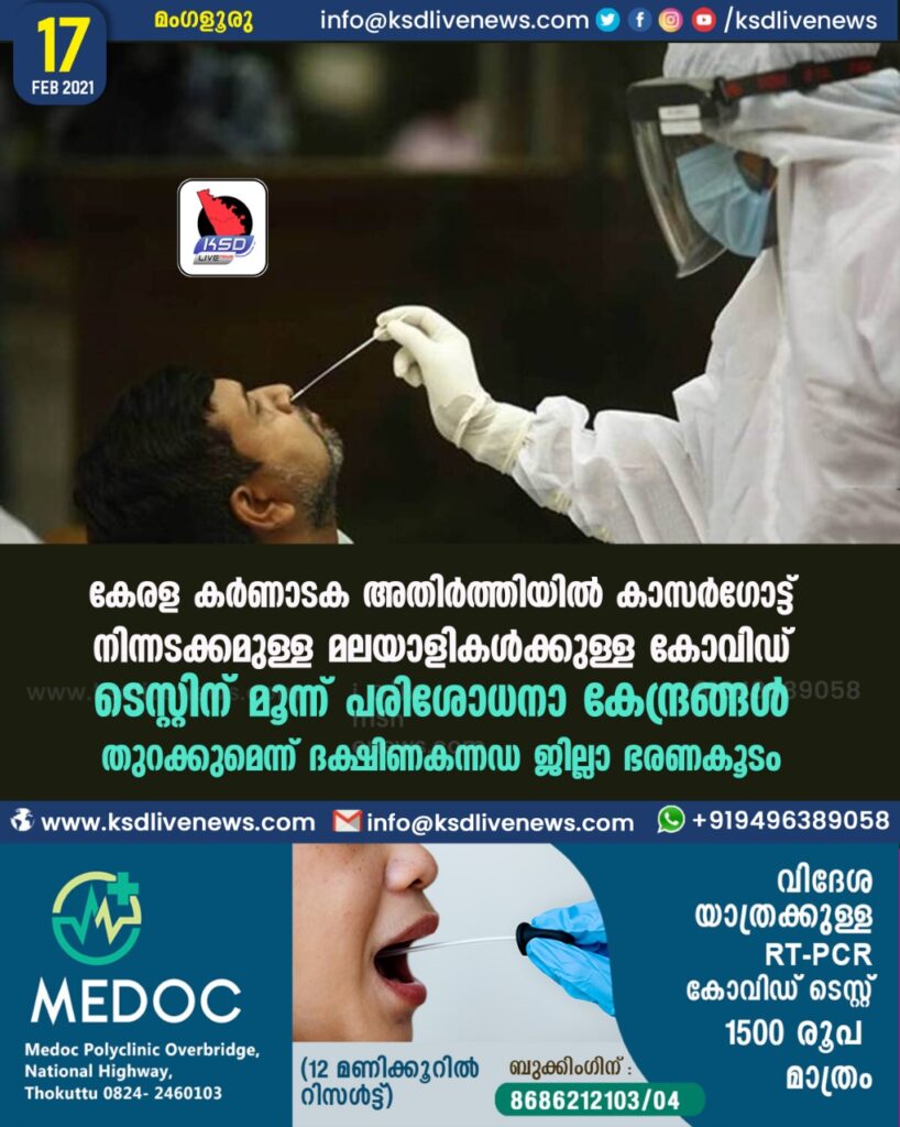 കേരള-കര്‍ണാടക അതിര്‍ത്തിയില്‍ കാസർഗോട്ട് നിന്നടക്കമുള്ള മലയാളികള്‍ക്കുള്ള കോവിഡ് ടെസ്റ്റിന് മൂന്ന് പരിശോധനാ കേന്ദ്രങ്ങള്‍ തുറക്കുമെന്ന് ദക്ഷിണകന്നഡ ജില്ലാ ഭരണകൂടം