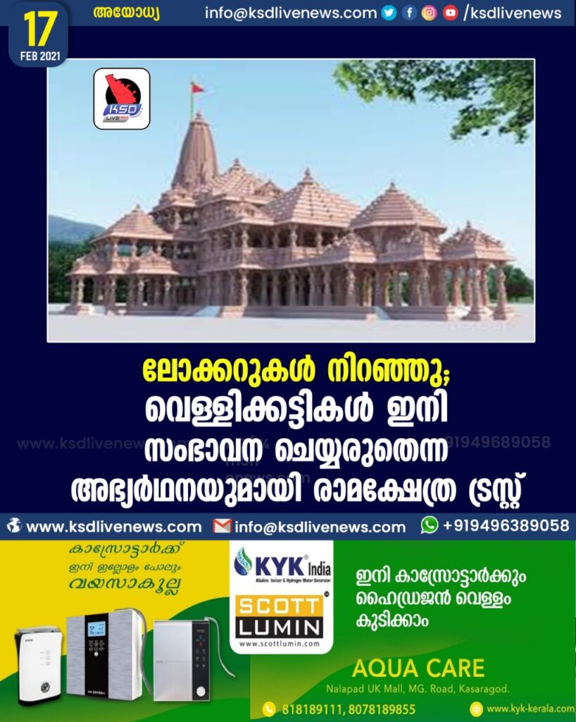 ‘രാമക്ഷേത്ര നിർമാണത്തിന് രാജ്യത്തിന്റെ വിവിധ ഭാഗങ്ങളിൽ നിന്നുളള ആളുകൾ വെള്ളിക്കട്ടികൾ അയയ്ക്കുന്നുണ്ട്. ഇതിനകം ഒരുപാട് വെളളിക്കട്ടികൾ ലഭിച്ചു. അതെല്ലാം എങ്ങനെ സുരക്ഷിതമായി സൂക്ഷിക്കാം എന്നതിനെ കുറിച്ച് ഞങ്ങൾ ഗൗരവമായി ചിന്തിച്ചുകൊണ്ടിരിക്കുകയാണ്. അതിനാൽ ഭക്തർ വീണ്ടും വെള്ളിക്കട്ടികൾ അയയ്ക്കരുതെന്ന് വിനീതമായി അഭ്യർഥിക്കുകയാണ്. വെള്ളിക്കട്ടികളാൽ ബാങ്ക് ലോക്കറുകൾ നിറഞ്ഞിരിക്കുകയാണ്.’ട്രസ്റ്റ് അംഗമായ അനിൽ മിശ്ര പറയുന്നു.