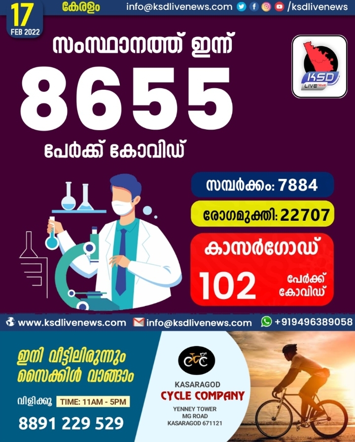 സംസ്ഥാനത്ത് ഇന്ന് 8655 കോവിഡ് സ്ഥിരീകരിച്ചു. സമ്പർക്കം വഴി 7884 പേർക്കും ; ആശ്വാസമായി 22707 പേർക്ക് രോഗമുക്തി ; കാസർഗോഡ് ജില്ലയിൽ 102 പേർക്ക് പുതിയ കോവിഡ് കേസുകൾ ; മരണം 18