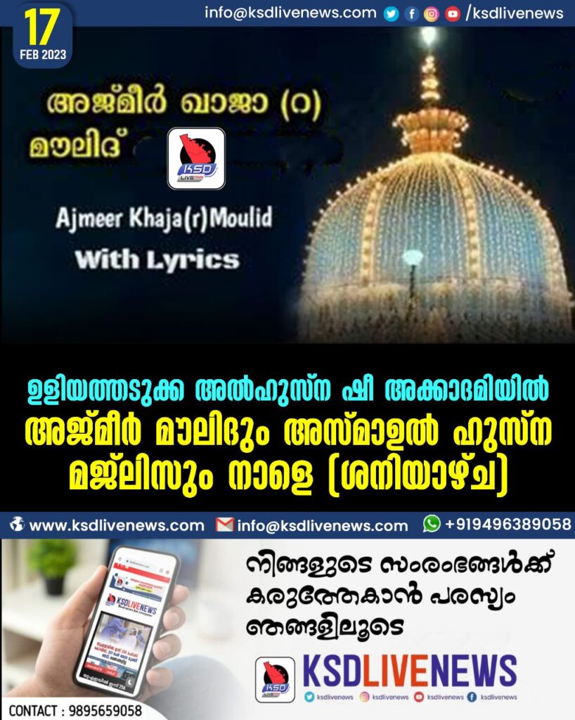ഉളിയത്തടുക്ക: അൽ ഹുസ്ന ഷീ അക്കാദമിയിൽ സുൽത്താനുൽ ഹിന്ദ് ഖാജാ മുഈനുദ്ധീനുൽ ജിശ്തി അൽ അജ്മീർ തങ്ങളുടെ പേരിലുള്ള മൗലീദും അസ്മാഉൽ ഹുസ്ന മജ്ലിസും നാളെ (ശനിയാഴ്ച) രാവിലെ 10 മണിക്ക് നടക്കും.