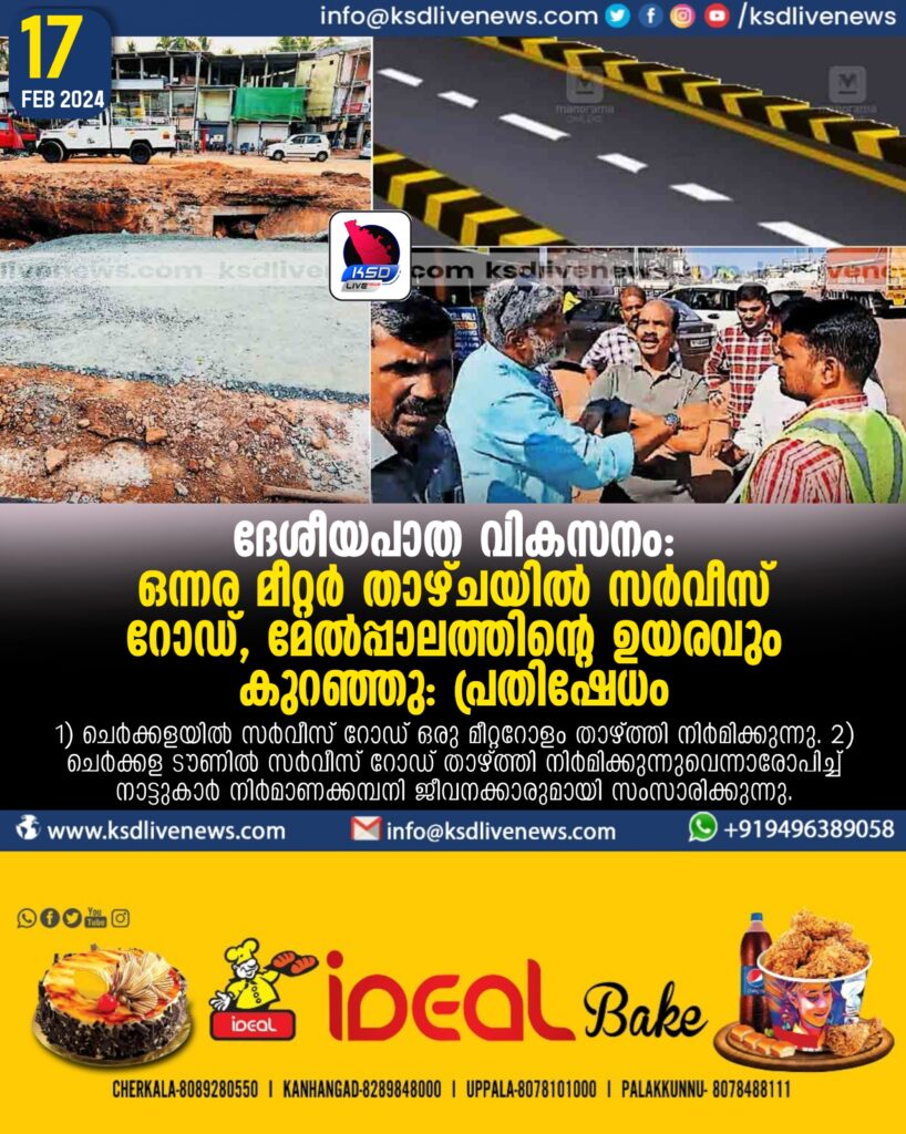 ചെർക്കള:. ദേശീയപാത വികസനത്തിൽ സർവീസ് റോഡ് ഒന്നര മീറ്റർ വരെ താഴ്ചയിൽ പണിയുന്നതിനു എതിരെ നാട്ടുകാർ പ്രക്ഷോഭത്തിൽ. ടൗൺ കീറിമുറിച്ചു സഞ്ചാര സ്വാതന്ത്ര്യം നിഷേധിക്കുന്നുവെന്നാണ് പരാതി. മേൽപാലം, സർവീസ് റോഡ് എന്നിവയുടെ നിർമാണം അശാസ്ത്രീയമാണ് എന്ന പരാതികൾ നിർമാണക്കമ്പനിക്ക് നാട്ടുകാർ നൽകി. ഇന്നു സൂചന സമരം നടക്കും. നിലവിലുള്ള റോഡിൽ നിന്നു ഒന്നര മീറ്റർ വരെ താഴ്ത്തി ആണ് സർവീസ് റോഡ് പണിയുന്നത്.രാജ്മോഹൻ ഉണ്ണിത്താൻ എംപി, എൻ.എ.നെല്ലിക്കുന്ന് എംഎൽഎ എന്നിവർ പ്രശ്നം പരിഹരിക്കാൻ ഇടപെടുമെന്ന് അറിയിച്ചിട്ടുണ്ട്. സി.എച്ച്.മുഹമ്മദ് കുഞ്ഞി ബടക്കേക്കര, സി.കെ.കെ.ഹാരിസ്, സി.എച്ച്.ഷുക്കൂർ, ഷാഫി ഇറാനി തുടങ്ങിയവർ അധികൃതരുമായി ചർച്ച നടത്തി.