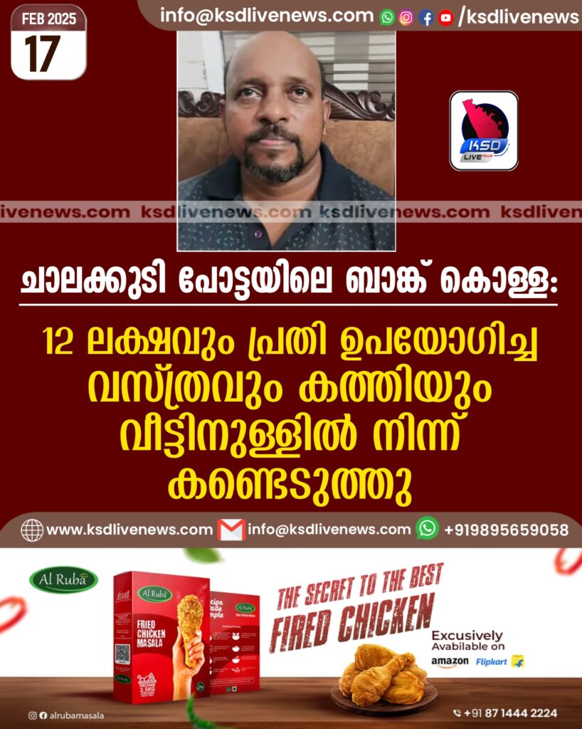 ചാലക്കുടി പോട്ടയിലെ ബാങ്ക് കൊള്ള: 12 ലക്ഷവും പ്രതി ഉപയോഗിച്ച വസ്ത്രവും കത്തിയും വീട്ടിനുള്ളിൽ നിന്ന് കണ്ടെടുത്തു