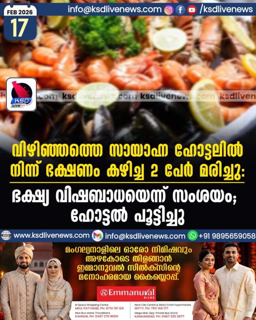 വിഴിഞ്ഞത്തെ സായാഹ്ന ഹോട്ടലില്‍ നിന്ന് ഭക്ഷണം കഴിച്ച 2 പേര്‍ മരിച്ചു: ഭക്ഷ്യ വിഷബാധയെന്ന് സംശയം; ഹോട്ടല്‍ പൂട്ടിച്ചു