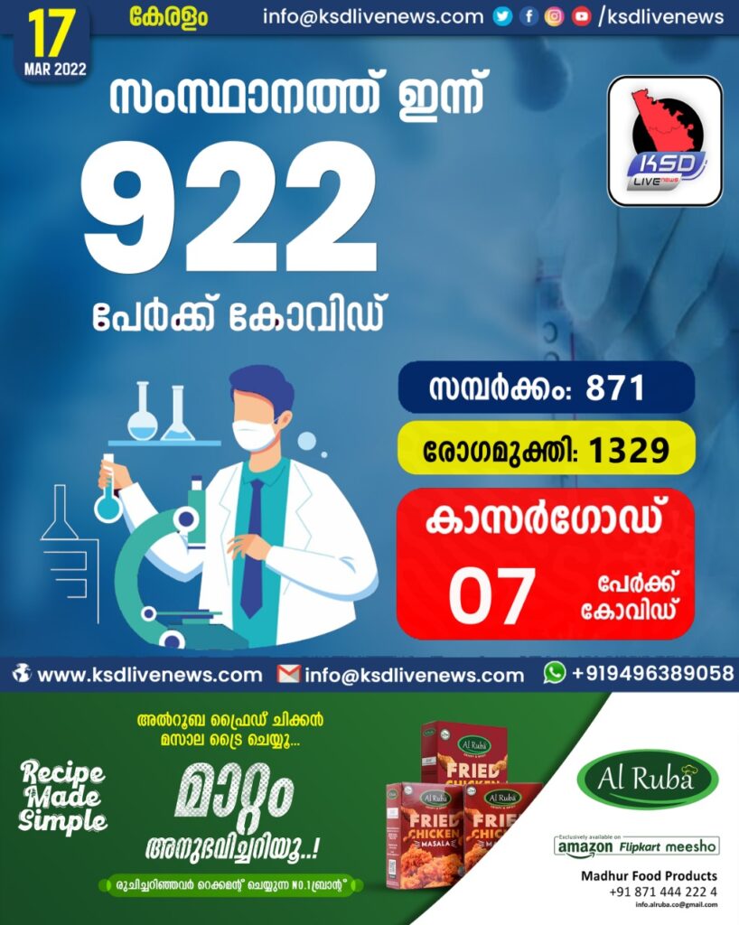 സംസ്ഥാനത്ത് ഇന്ന് 922 കോവിഡ് സ്ഥിരീകരിച്ചു. സമ്പർക്കം വഴി 871 പേർക്കും ; ആശ്വാസമായി 1329 പേർക്ക് രോഗമുക്തി ; കാസർഗോഡ് ജില്ലയിൽ 07 പേർക്ക് പുതിയ കോവിഡ് കേസുകൾ ; മരണം 00