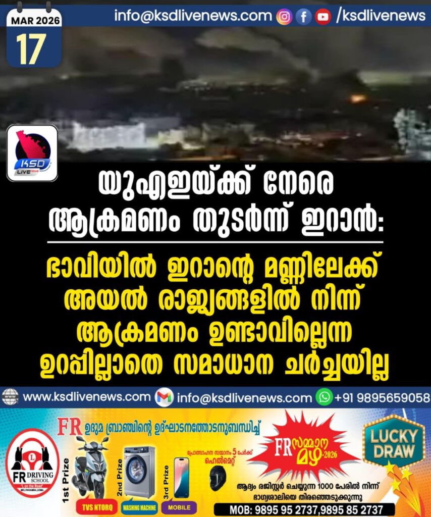 യുഎഇയ്ക്ക് നേരെ ആക്രമണം തുടര്‍ന്ന് ഇറാൻ; ഭാവിയിൽ ഇറാന്റെ മണ്ണിലേക്ക് അയൽ രാജ്യങ്ങളിൽ നിന്ന് ആക്രമണം ഉണ്ടാവില്ലെന്ന ഉറപ്പില്ലാതെ സമാധാന ചർച്ചയില്ല