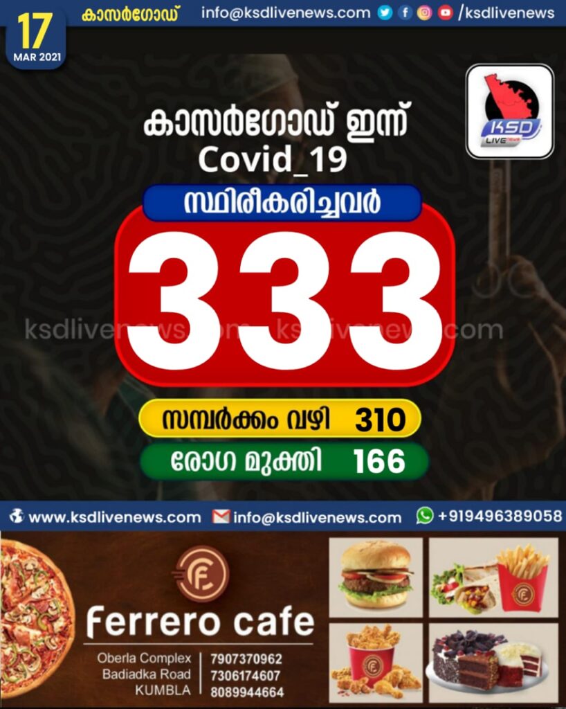 കാസർഗോഡ് ജില്ലയിൽ ഇന്ന് 333 പേർക്ക് കോവിഡ് സ്ഥിരീകരിച്ചു. സമ്പർക്കം വഴി 310 പേർക്കും. 166 പേർക്ക് രോഗമുക്തി
