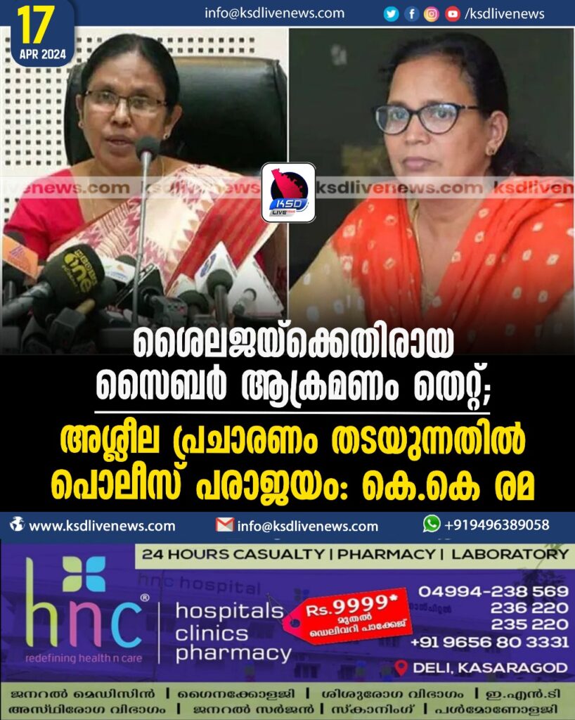 ശൈലജയ്ക്കെതിരായ സൈബര്‍ ആക്രമണം തെറ്റ്, അശ്ലീല പ്രചാരണം തടയുന്നതില്‍ പൊലീസ് പരാജയം: കെ കെ രമ