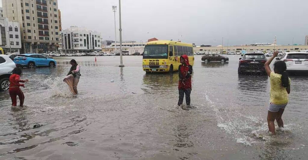 യുഎഇയിൽ തോരാതെ പെയ്ത മഴക്ക് അല്പം ശമനം; വെള്ളക്കെട്ടിൽ ‘ചിരിച്ചുല്ലസിച്ച് ‘ കുട്ടികൾ; നാട്ടിലെ മഴക്കാഴ്ചകൾ ഗൃഹാതുര ഓർമകളായപ്പോൾ