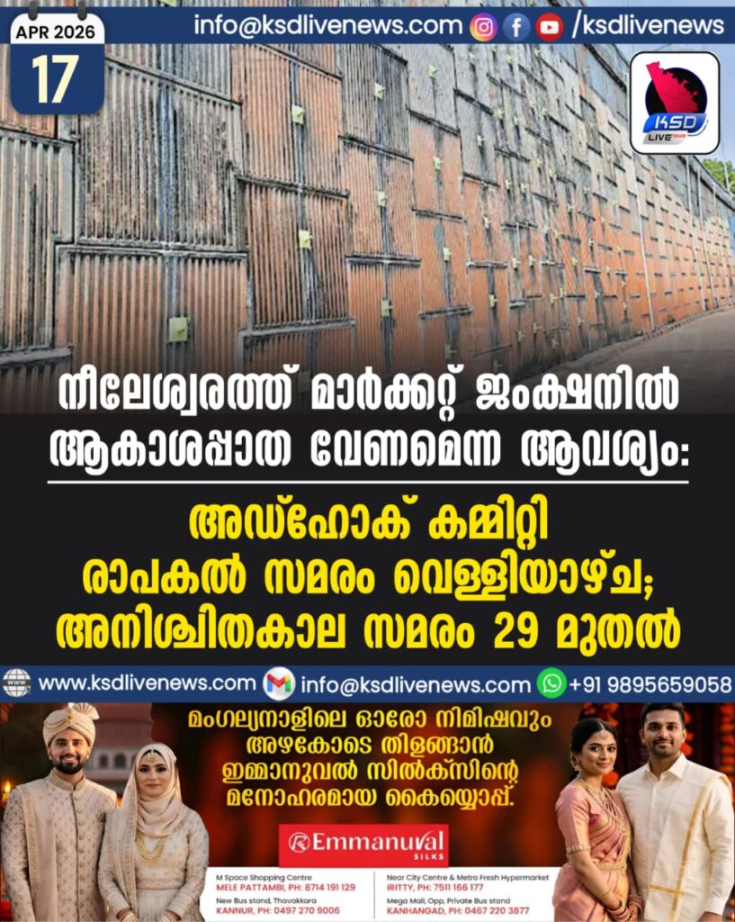 നീലേശ്വരത്ത് മാർക്കറ്റ് ജംക്ഷനിൽ ആകാശപ്പാത വേണമെന്ന ആവശ്യം: അഡ്ഹോക് കമ്മിറ്റി രാപകൽ സമരം വെള്ളിയാഴ്ച; അനിശ്ചിതകാല സമരം 29 മുതൽ
