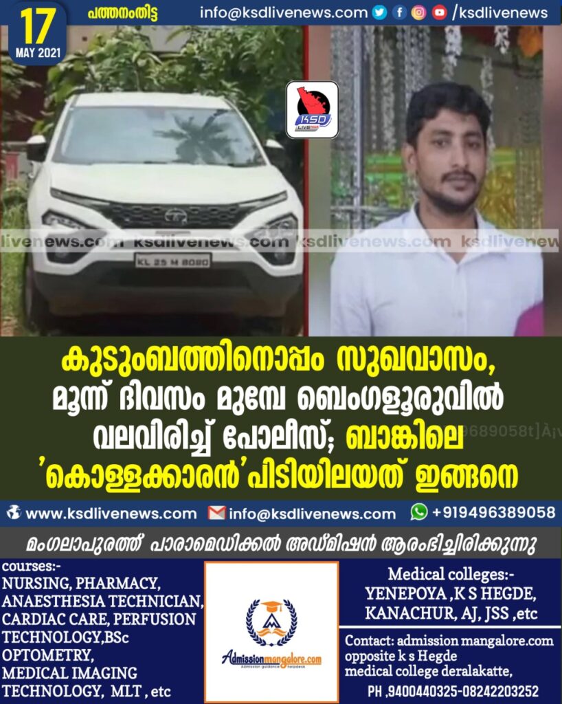 കുടുംബത്തിനൊപ്പം സുഖവാസം, മൂന്ന് ദിവസം മുമ്പേ ബെംഗളൂരുവില് വലവിരിച്ച് പോലീസ്; ബാങ്കിലെ ‘കൊള്ളക്കാരന്’പിടിയിലയത് ഇങ്ങനെ