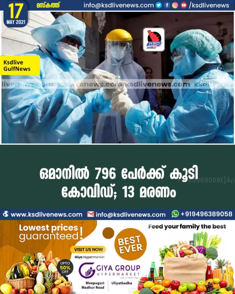 ഒമാനില് 796 പേർക്ക് കൂടി കോവിഡ്; 13 മരണം
