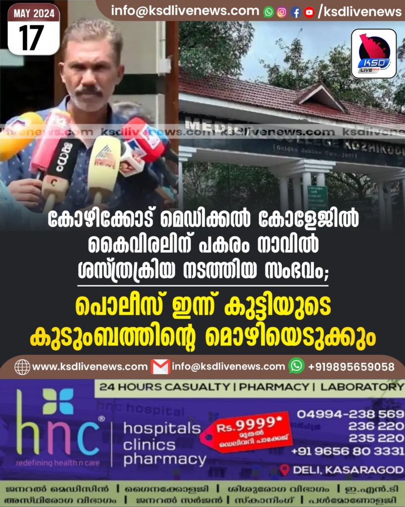 കോഴിക്കോട് മെഡിക്കൽ കോളേജിൽ കൈവിരലിന് പകരം നാവില്‍ ശസ്ത്രക്രിയ നടത്തിയ സംഭവം; പൊലീസ് ഇന്ന് കുട്ടിയുടെ കുടുംബത്തിന്റെ മൊഴിയെടുക്കും