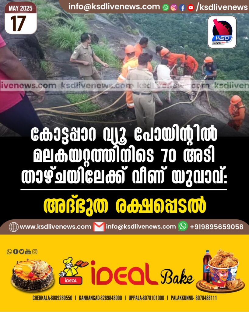 കോട്ടപ്പാറ വ്യൂ പോയിന്റിൽ മലകയറ്റത്തിനിടെ 70 അടി താഴ്ചയിലേക്ക് വീണ് യുവാവ്: അദ്ഭുത രക്ഷപ്പെടൽ