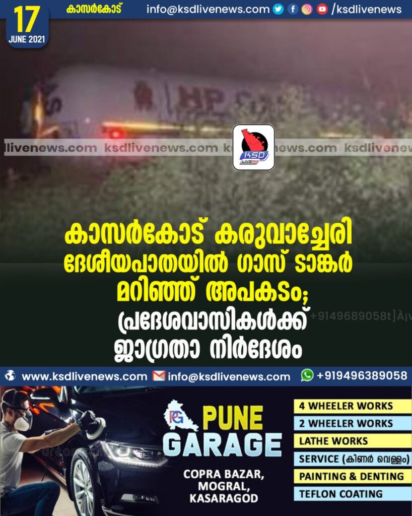 കാസര്കോട് കരുവാച്ചേരി ദേശീയപാതയിൽ ഗാസ് ടാങ്കര് മറിഞ്ഞ് അപകടം; പ്രദേശവാസികള്ക്ക് ജാഗ്രതാ നിര്ദേശം
