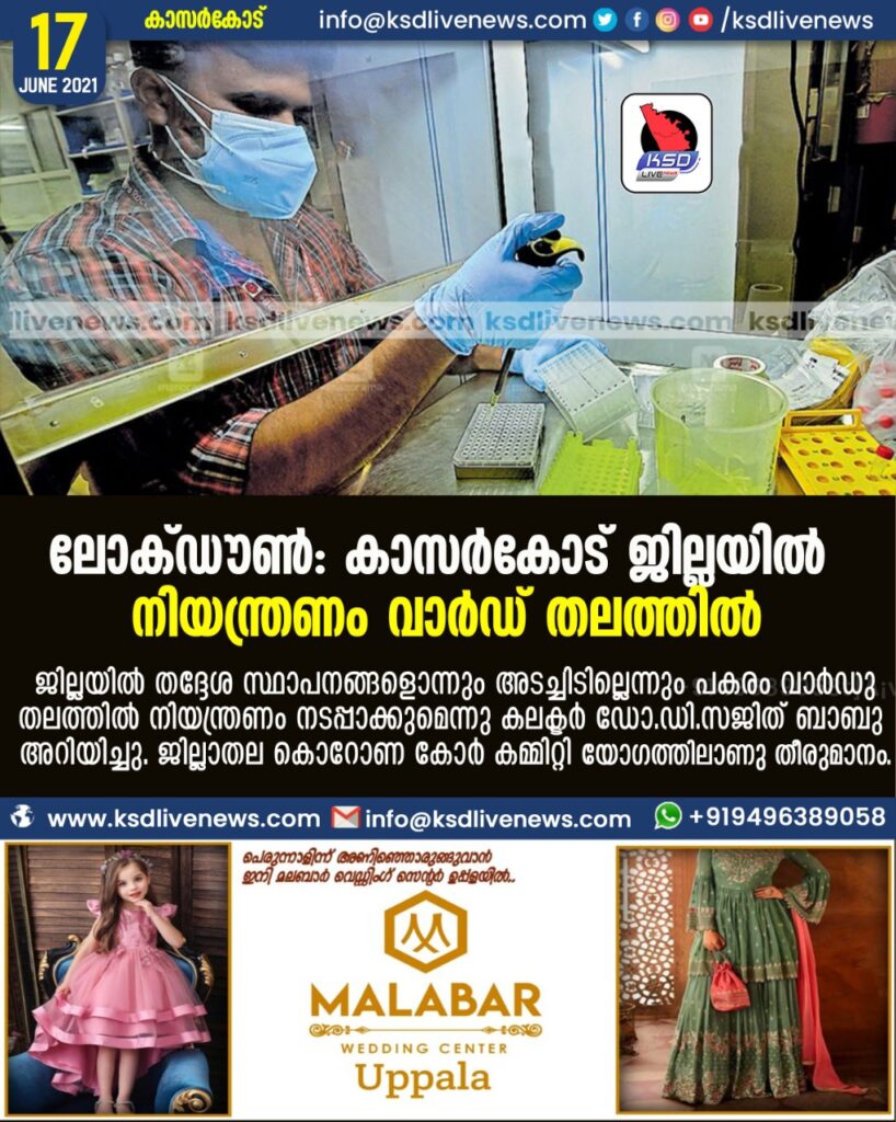 കാസർകോട് ∙ സംസ്ഥാന തലത്തിലുള്ള ലോക്ഡൗൺ ഇളവുകൾ നടപ്പിലാക്കുമ്പോൾ ജില്ലയിൽ തദ്ദേശ സ്ഥാപനങ്ങളൊന്നും അടച്ചിടില്ലെന്നും പകരം വാർഡുതലത്തിൽ നിയന്ത്രണം നടപ്പാക്കുമെന്നു കലക്ടർ ഡോ.ഡി.സജിത് ബാബു അറിയിച്ചു. ജില്ലാതല കൊറോണ കോർ കമ്മിറ്റി യോഗത്തിലാണു തീരുമാനം. രോഗ നിരക്ക് കണക്കാക്കിയായിരിക്കും പ്രാദേശികതലത്തിലെ അടച്ചിടൽ. ജില്ലാ ദുരന്ത നിവാരണ അതോറിറ്റി രോഗവിവരങ്ങളുടെ ക്രോഡീകരിച്ച കണക്ക് എല്ലാ ചൊവ്വാഴ്ചയും കലക്ടർക്കു സമർപ്പിക്കണം.