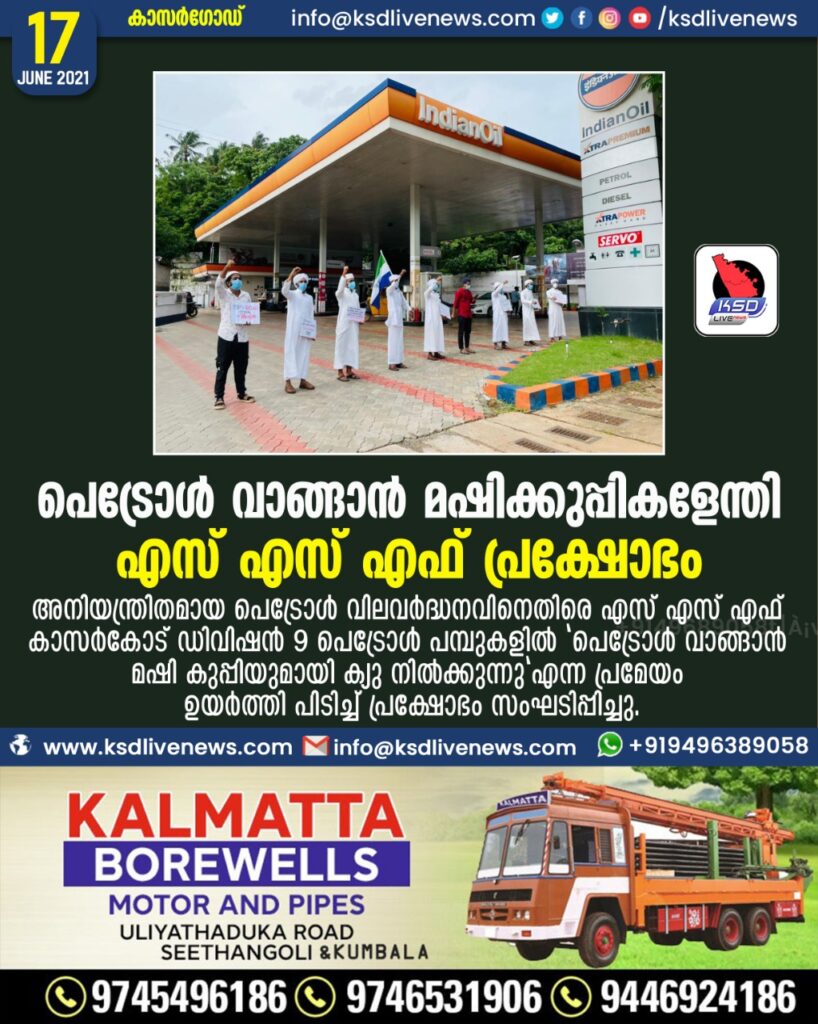 ഡിവിഷൻ പരിധിയിലെ ഉളിയത്തടുക്ക, വിദ്യാ നഗർ, കറന്തക്കാട്, നുള്ളിപ്പാടി, കാസർകോട്, ചെർക്കള തുടങ്ങിയ 9 പെട്രോൾ പമ്പുകളിൽ “പെട്രോൾ വാങ്ങാൻ മഷി കുപ്പിയുമായി ക്യു നിൽക്കുന്നു”എന്ന പ്രമേയം ഉയർത്തി പിടിച്ച് കോവിഡ് പ്രോട്ടോകോൾ പാലിച്ച് നടത്തിയ പ്രക്ഷോഭം കോർപ്പറേറ്റ് താത്പര്യങ്ങൾ സംരക്ഷിക്കുന്ന ഭരണകൂടത്തിന് താക്കീത് നൽകി. വിത്യസ്ഥ കേന്ദ്രങ്ങളിൽ ജില്ലാ ഭാരവാഹികളായ ശംസീർ സൈനി, ബാദ്ഷാ സഖാഫി, തസ്ലീം കുന്നിൽ, ഫാറൂഖ് സഖാഫി എരോൽ ഡിവിഷൻ ഭാരവാഹികളായ റസാഖ് സഅദി,മുർഷിദ് പുളിക്കൂർ, ഫയാസ് പട്ള മനാസ് ഹിമമി, ഖാദർ ഹിമമി, അഷ്റഫ് സഖാഫി, അഷ്റഫ് ബള്ളൂർ, മാഹിൻ പട്ള തുടങ്ങിയവർ നേതൃത്വം നൽകി. ഓരോ കേന്ദ്രത്തിലും പത്തോളം പ്രവർത്തകർ സംബന്ധിച്ചു.