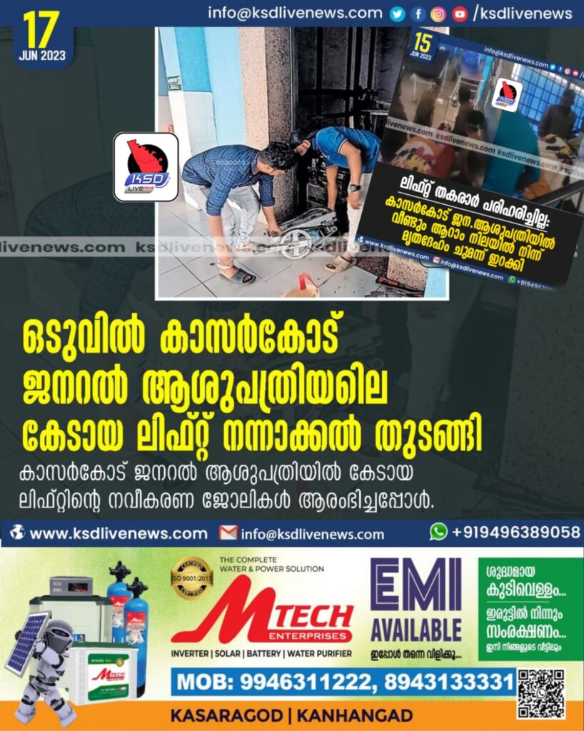 ഒടുവിൽ ജനറൽ കാസർകോട് ആശുപത്രിയിലെ കേടായ ലിഫ്റ്റ് നന്നാക്കൽ തുടങ്ങി