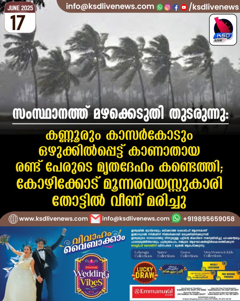 സംസ്ഥാനത്ത് മഴക്കെടുതി തുടരുന്നു: കണ്ണൂരും കാസർകോടും ഒഴുക്കിൽപ്പെട്ട് കാണാതായ രണ്ട് പേരുടെ മൃതദേഹം കണ്ടെത്തി; കോഴിക്കോട് മൂന്നരവയസ്സുകാരി തോട്ടിൽ വീണ് മരിച്ചു