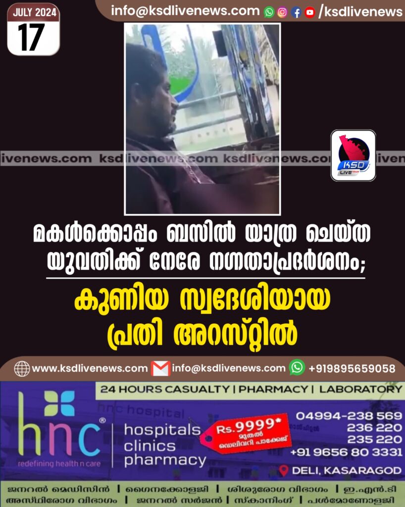 മകള്‍ക്കൊപ്പം ബസില്‍ യാത്രചെയ്ത യുവതിക്ക് നേരേ നഗ്നതാപ്രദര്‍ശനം; കുണിയ സ്വദേശിയായ പ്രതി അറസ്റ്റിൽ