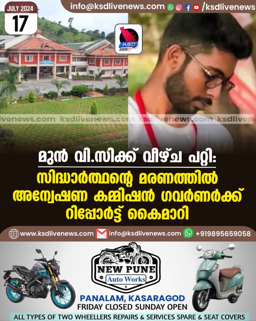 മുൻ വി.സിക്ക് വീഴ്ച പറ്റി: സിദ്ധാർത്ഥന്റെ മരണത്തിൽ അന്വേഷണ കമ്മിഷൻ ഗവർണർക്ക് റിപ്പോർട്ട് കൈമാറി