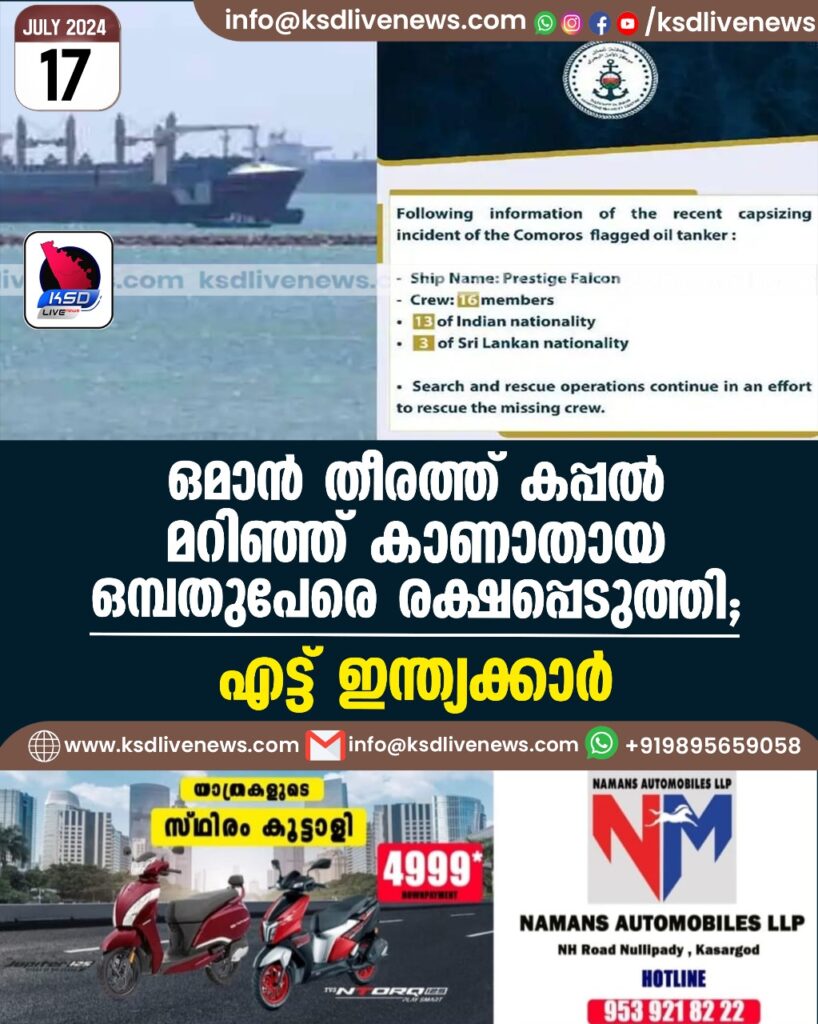 13 ഇന്ത്യക്കാരും മൂന്ന് ശ്രീലങ്കന് പൗരന്മാരും അടക്കം 16 ജീവനക്കാരാണ് കപ്പലില് ഉണ്ടായിരുന്നത്. ഒമാനിലെ ദുക്കത്തിനുസമീപം റാസ് മദ്രാക്ക പ്രദേശത്തിന് തെക്കുകിഴക്ക് 25 നോട്ടിക്കല് മൈല് (28.7 മൈല്) അകലെ തിങ്കളാഴ്ചയാണ് എണ്ണക്കപ്പല് മറിഞ്ഞത്. കൊമോറോസ് പതാകവെച്ച പ്രെസ്റ്റീജ് ഫാല്ക്കണ് കപ്പലാണ് അപകടത്തില്പ്പെട്ടത്.