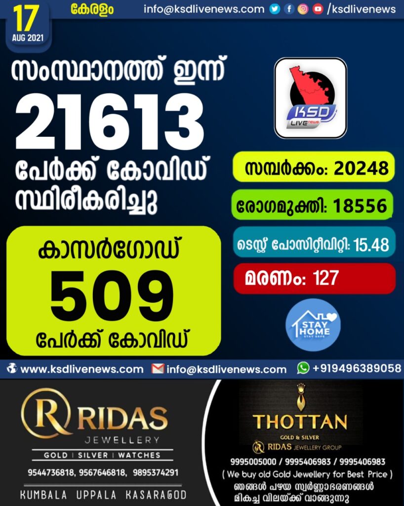 സംസ്ഥാനത്ത് ഇന്ന് 21613 പേർക്ക് കോവിഡ് സ്ഥിരീകരിച്ചു. സമ്പർക്കം വഴി 20248 പേർക്കും ; ആശ്വാസമായി 18556 പേർക്ക് രോഗ മുക്തിയും ; കാസർഗോഡ് ജില്ലയിൽ 509 പേർക്ക് പുതിയ കോവിഡ് കേസുകൾ ; മരണം 127