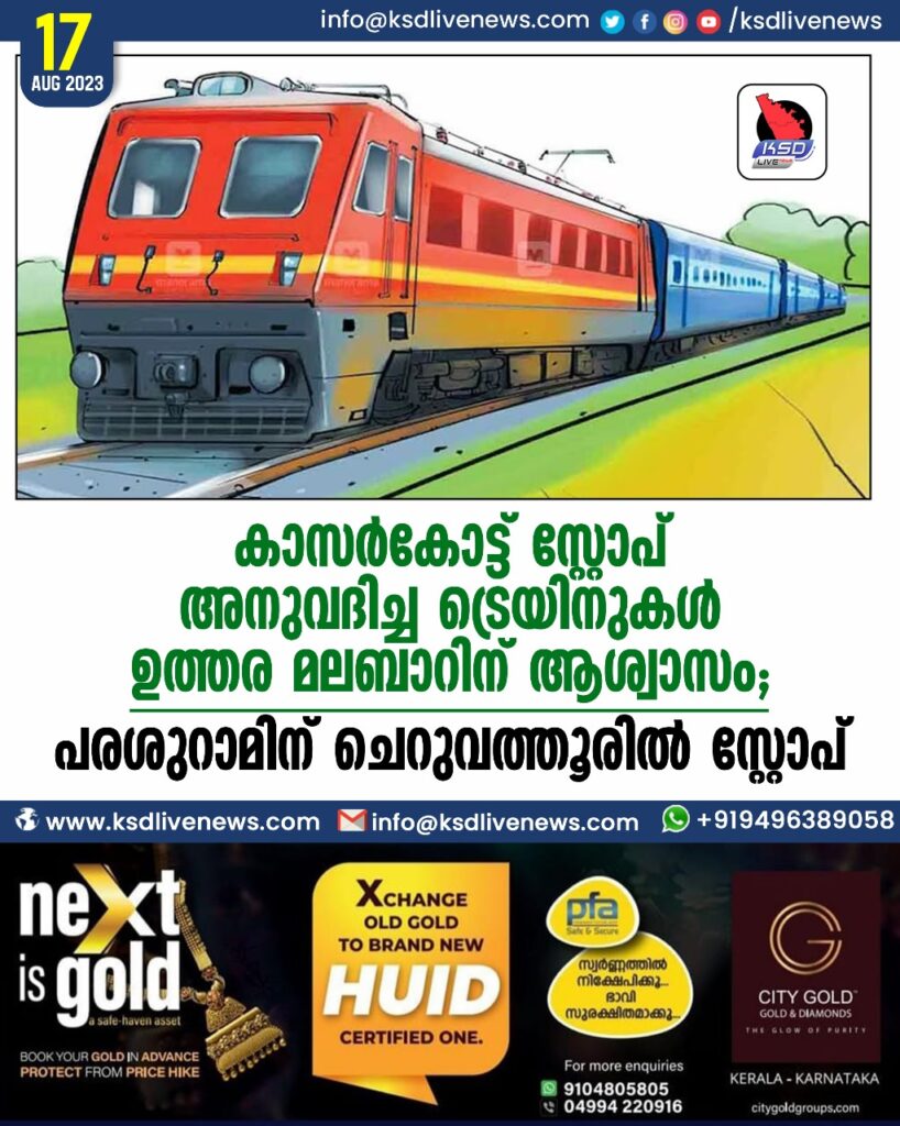കാസർകോട്ട് സ്റ്റോപ് അനുവദിച്ച ട്രെയിനുകൾ ഉത്തര മലബാറിന് ആശ്വാസം; പരശുറാമിന് ചെറുവത്തൂരിൽ സ്റ്റോപ്