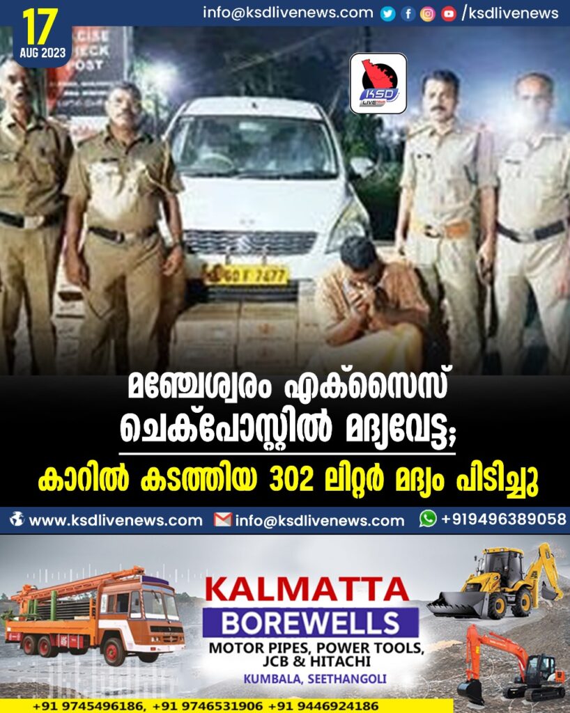 മഞ്ചേശ്വരം എക്സൈസ് ചെക്പോസ്റ്റിൽ മദ്യവേട്ട; കാറിൽ കടത്തിയ 302 ലിറ്റർ മദ്യം പിടിച്ചു