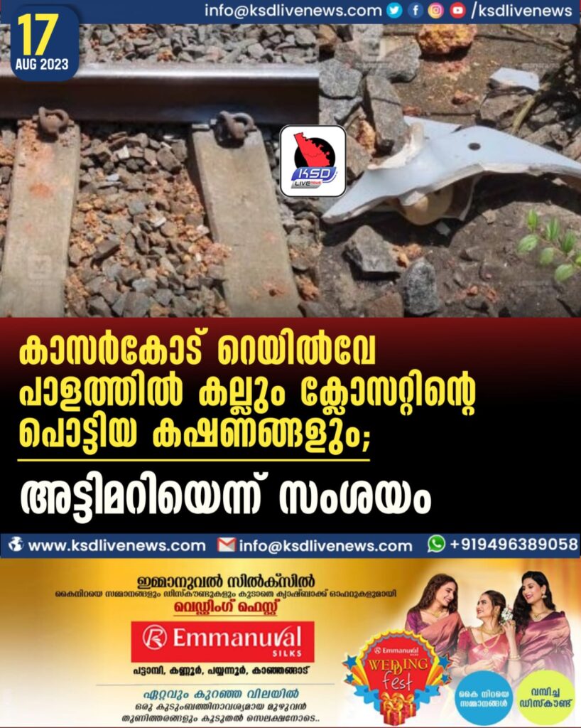 കാസർകോട് റെയിൽവേ പാളത്തിൽ കല്ലും ക്ലോസറ്റിന്റെ പൊട്ടിയ കഷണങ്ങളും; അട്ടിമറിയെന്ന് സംശയം