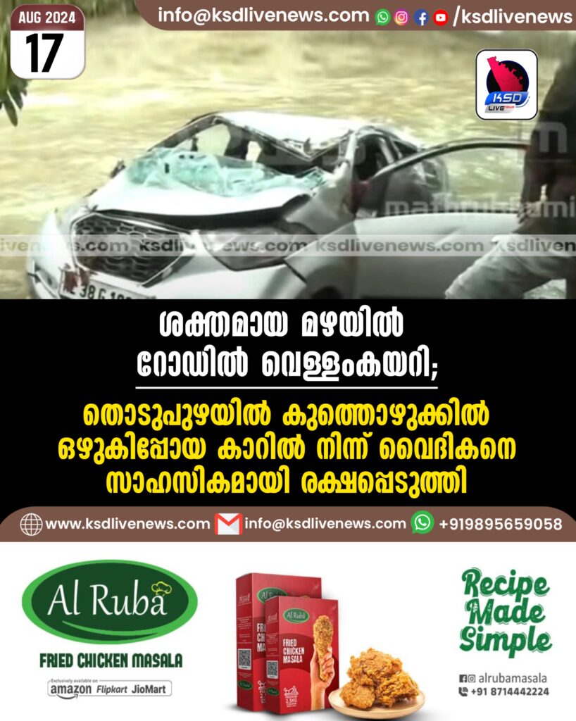 ശക്തമായ മഴയിൽ റോഡില്‍ വെള്ളംകയറി; തൊടുപുഴയിൽ കുത്തൊഴുക്കില്‍ ഒഴുകിപ്പോയ കാറിൽ നിന്ന് വൈദികനെ സാഹസികമായി രക്ഷപ്പെടുത്തി