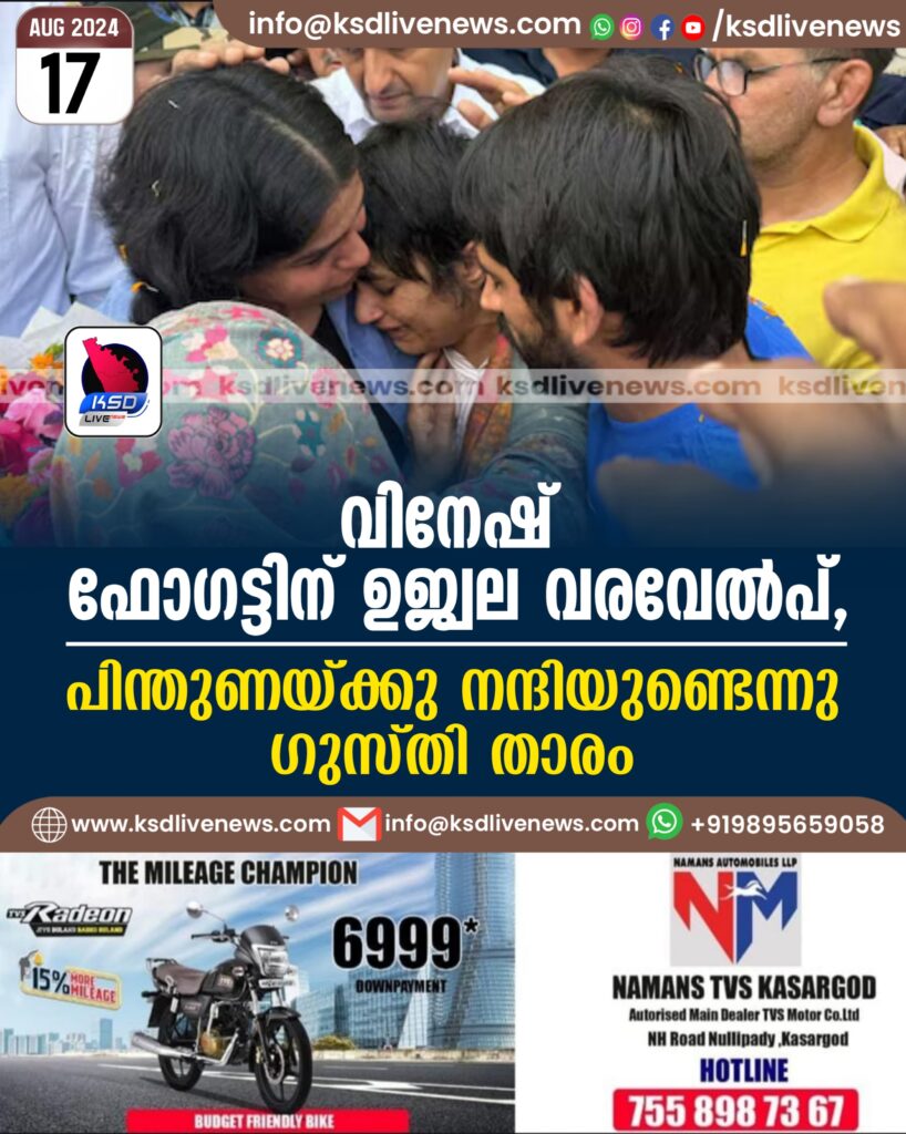 വിനേഷ് ഫോഗട്ടിന് ഉജ്വല വരവേൽപ്, പിന്തുണയ്ക്കു നന്ദിയുണ്ടെന്നു ഗുസ്തി താരം