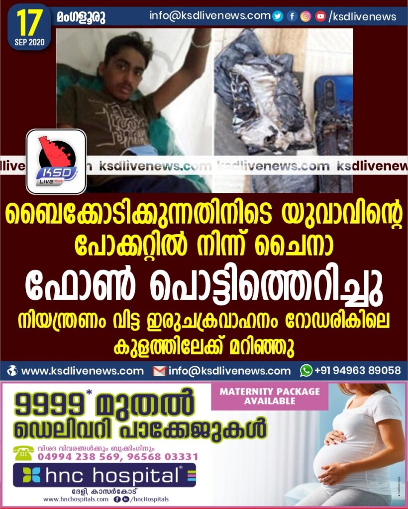 ബൈക്കോടിക്കുന്നതിനിടെ യുവാവിന്റെ പോക്കറ്റിൽ നിന്ന് ചൈനാ ഫോണ് പൊട്ടിത്തെറിച്ചു ; നിയന്ത്രണം വിട്ട ഇരുചക്രവാഹനം റോഡരികിലെ കുളത്തിലേക്ക് മറിഞ്ഞു
