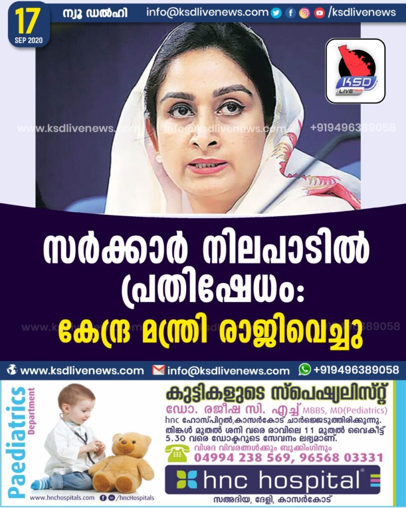 കേന്ദ്ര സർക്കാർ അവതരിപ്പിച്ച വിവാദമായ ഫാം സെക്ടര്‍ ബില്ലിൽ പ്രതിഷേധിച്ച് കേന്ദ്ര മന്ത്രി രാജിവെച്ചു. ഹര്‍സിമ്രത് കൗര്‍ ബാദലാണ് മോദി മന്ത്രിസഭയിൽ നിന്ന് പ്രതിഷേധിച്ച് രാജിവെച്ചിരിക്കുന്നത്.ബിജെപി സഖ്യകക്ഷിയായ അകാലിദളില്‍ നിന്നുള്ള മന്ത്രിയാണ് ഹര്‍സിമ്രത് കൗര്‍ ബാദല്‍. ബില്‍ ലോക്‌സഭയില്‍ അവതരിപ്പിച്ചതിന് പിന്നാലെ ഇതിനെ എതിര്‍ക്കുമെന്ന് അകാലിദള്‍ നേതാവ് സുഖ്ബിര്‍ ബാദല്‍ വ്യക്തമാക്കിയിരുന്നു. ഇതിന് പിന്നാലെയാണ് മന്ത്രിയുടെ രാജി ഉണ്ടായിരിക്കുന്നത്. ബില്ലിനെതിരെ പഞ്ചാബ്, ഹരിയാണ സംസ്ഥാനങ്ങളില്‍ പ്രതിഷേധം നടക്കുന്നുണ്ട്. ഈ പ്രതിഷേധങ്ങള്‍ അവഗണിച്ചാണ് സര്‍ക്കാര്‍ മുന്നോട്ടുപോകുന്നത്. ബില്‍ അവതരിപ്പിക്കുന്നത് മാറ്റിവെക്കണമെന്ന് അകാലിദള്‍ ബിജെപിയോട് ആവശ്യപ്പെട്ടിരുന്നു. എന്നാല്‍ ഇത് അവഗണിച്ച് മുന്നോട്ടുപോയതോടെയാണ് പ്രതിഷേധമായി ഹര്‍സിമ്രത് കൗര്‍ രാജിവെച്ചത്.ബില്ലിനെ ആദ്യം അനുകൂലിച്ചവരായിരുന്നു അകാലിദള്‍. ബില്ലിനെ എതിര്‍ക്കുമ്പോഴും ബിജെപിക്കുള്ള പിന്തുണ തുടരുമെന്ന് അകാലിദള്‍ പറയുന്നു. ലോക്‌സഭയില്‍ ബില്ലിനെതിരെ വോട്ട് ചെയ്യാനാണ് അകാലിദള്‍ തീരുമാനം.
