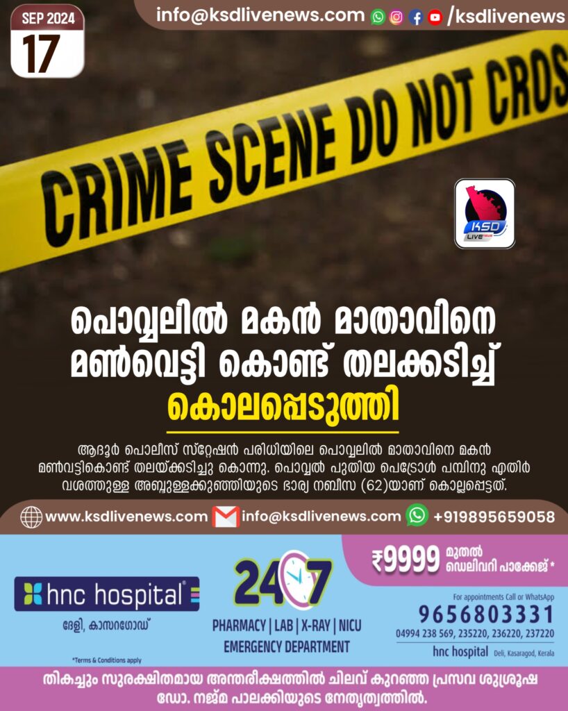 കാസർകോട്: ആദൂർ പൊലീസ് സ്റ്റേഷൻ പരിധിയിലെ പൊവ്വലിൽ മാതാവിനെ മകൻ മൺവട്ടികൊണ്ട് തലയ്ക്കടിച്ചു കൊന്നു. പൊവ്വൽ പുതിയ പെട്രോൾ പമ്പിനു എതിർ വശത്തുള്ള അബ്ദുള്ളക്കുഞ്ഞിയുടെ ഭാര്യ നബീസ (62)യാണ് കൊല്ലപ്പെട്ടത്. അക്രമം തടയാനുള്ള _ശ്രമത്തിനിടയിൽ ജ്യേഷ്ഠൻ മജീദിനു പരിക്കേറ്റു. ഇദ്ദേഹത്തെ ചെങ്കളയിലെ സഹകരണ ആശുപത്രിയിൽ പ്രവേശിപ്പിച്ചു. ചൊവ്വാഴ്ച്ച വൈകുന്നേരം നാലു മണിയോടെയാണ് സംഭവം. സംഭവത്തിൽ നബീസയുടെ മകൻ നാസറിനെ ആദൂർ പൊലീസ് കസ്റ്റഡിയിലെടുത്തു