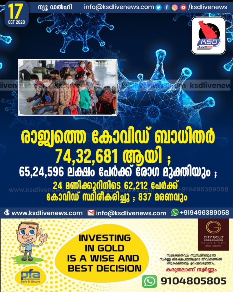 24 മണിക്കൂറിനിടെ 62,212 പേർക്ക് കോവിഡ് സ്ഥിരീകരിച്ചു ; 837 മരണവും