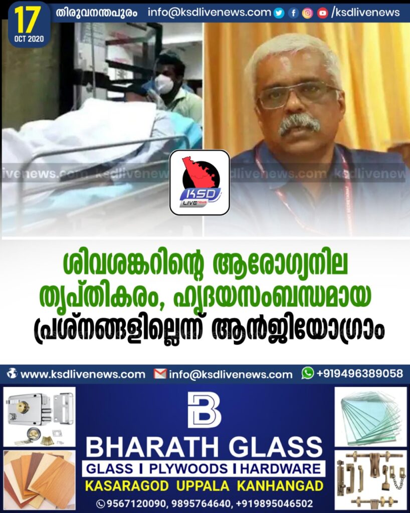 ശിവശങ്കറിന്റെ ആരോഗ്യനില തൃപ്തികരം , ഹൃദയസംബന്ധമായ പ്രശ്നങ്ങളില്ലെന്ന് ആൻജിയോഗ്രാം