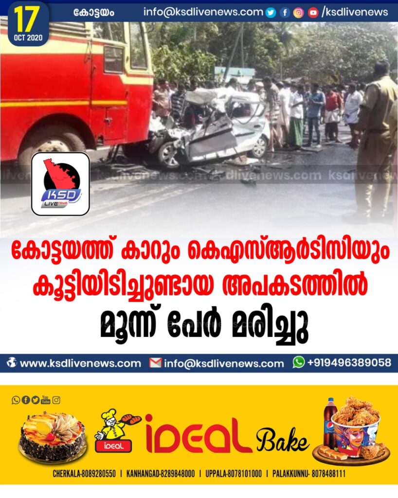 കോട്ടയത്ത് കാറും കെഎസ്ആർടിസിയും കൂട്ടിയിടിച്ചുണ്ടായ അപകടത്തിൽ മൂന്ന് പേർ മരിച്ചു