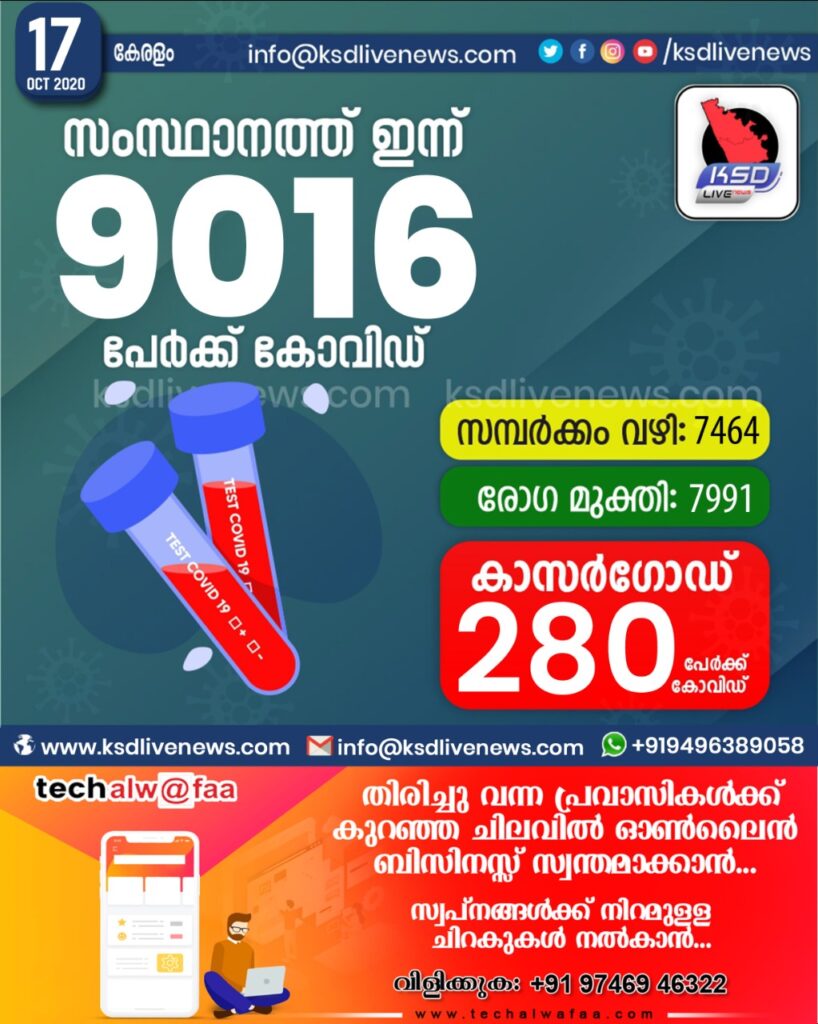 സംസ്ഥാനത്ത് ഇന്ന് 9016 പേർക്ക് കോവിഡ് സ്ഥിരീകരിച്ചു. സമ്പർക്കം വഴി 7464 പേർക്കും.രോഗ മുക്തി 7991 പേർക്കും. കാസർഗോഡ് ജില്ലയിൽ ഇന്ന് 280 പേർക്ക് കോവിഡ് സ്ഥിരീകരിച്ചു. മരണം 26