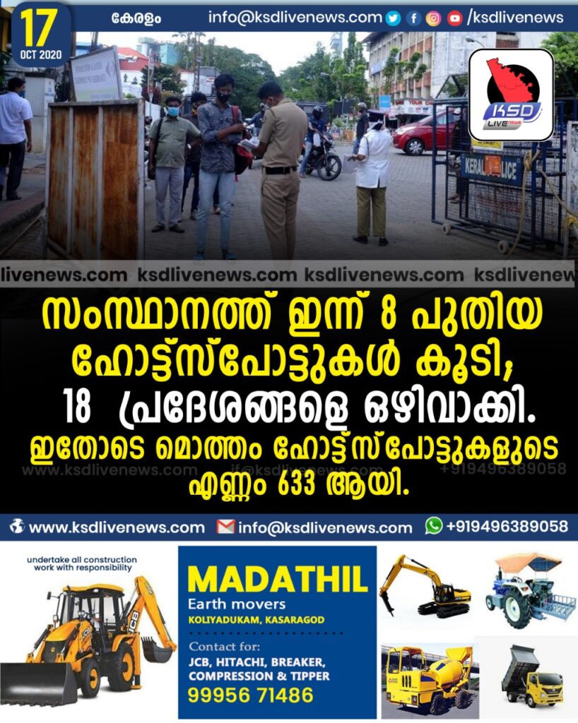 സംസ്ഥാനത്ത് ഇന്ന് 8 പുതിയ ഹോട്ട്സ്പോട്ടുകള് കൂടി; 18 പ്രദേശങ്ങളെ ഒഴിവാക്കി.ഇതോടെ മൊത്തം ഹോട്ട്സ്പോട്ടുകളുടെ എണ്ണം 633 ആയി.