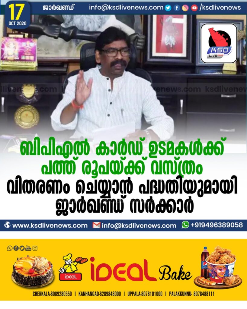 ബിപിഎല്‍ കാര്‍ഡ് ഉടമകള്‍ക്ക് പത്ത് രൂപയ്ക്ക് വസ്ത്രം വിതരണം ചെയ്യാന്‍ പദ്ധതിയുമായി ജാര്‍ഖണ്ഡ് സര്‍ക്കാര്‍.മുഖ്യമന്ത്രി ഹേമന്ത് സോറന്റെ അധ്യക്ഷതയില്‍ ചേര്‍ന്ന സംസ്ഥാന മന്ത്രിസഭാ യോഗത്തിലാണ് ഇക്കാര്യത്തില്‍ തീരുമാനമെടുത്തത്. ആറ് മാസത്തെ ഇടവേളകളിലായി പത്ത് രൂപയ്ക്ക് വസ്ത്രം നല്‍കാനാണ് തീരുമാനം. പുരുഷന്മാര്‍ക്ക് ലുങ്കിളും ദോത്തികളും സ്ത്രീകള്‍ക്ക് സാരികളുമാണ് നല്‍കുക.