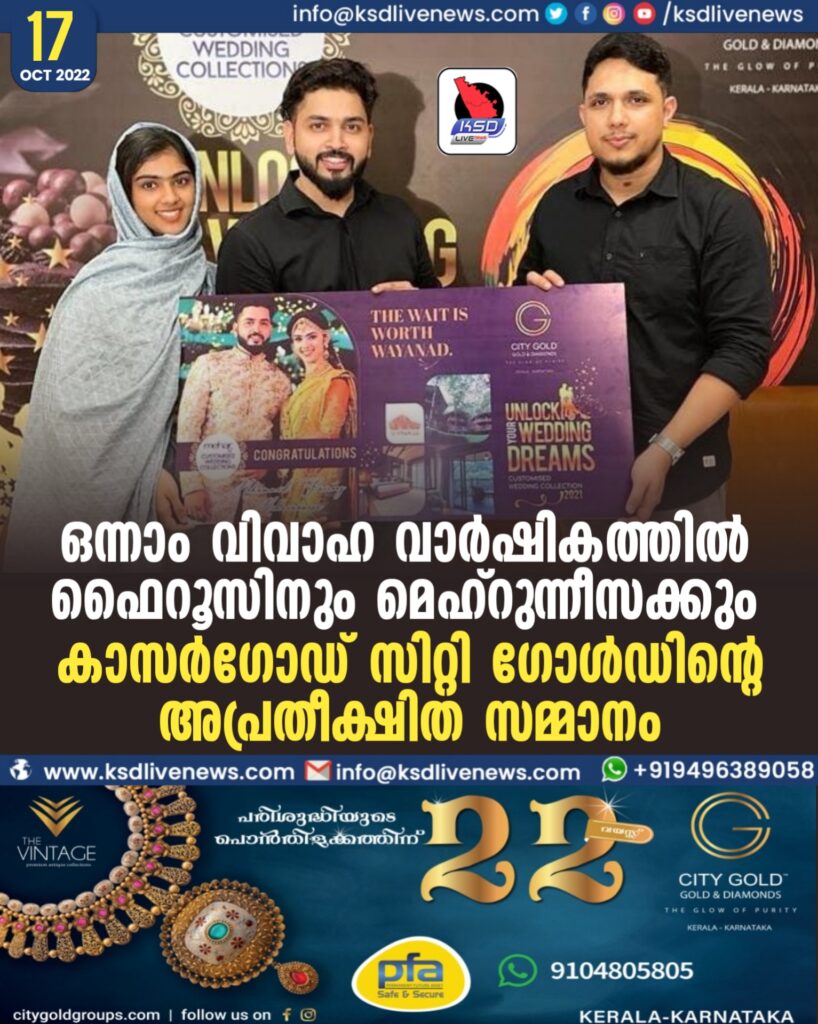 ഒന്നാം വിവാഹ വാർഷികത്തിൽ ഫൈറൂസിനും മെഹ്റുന്നീസക്കും കാസർഗോഡ് സിറ്റി ഗോൾഡിന്റെ അപ്രതീക്ഷിത സമ്മാനം