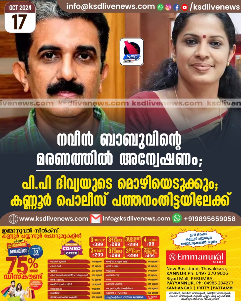 നവീനെതിരെ അഴിമതി ആരോപണമുന്നയിച്ച കണ്ണൂർ ജില്ലാ പഞ്ചായത്ത് പ്രസിഡന്റ് പിപി ദിവ്യയുടെ മൊഴിയെടുക്കും. അന്വേഷണത്തിന് കണ്ണൂർ പൊലീസ് പത്തനംതിട്ടയിലേക്ക് എത്തും.