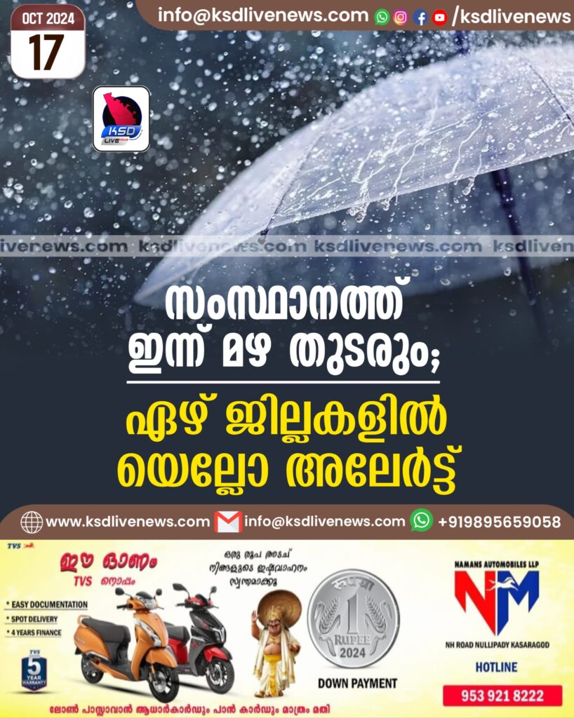 സംസ്ഥാനത്ത് ഇന്ന് കൂടി മഴ തുടരും; ഏഴ് ജില്ലകളിൽ യെല്ലോ അലേർട്ട്
