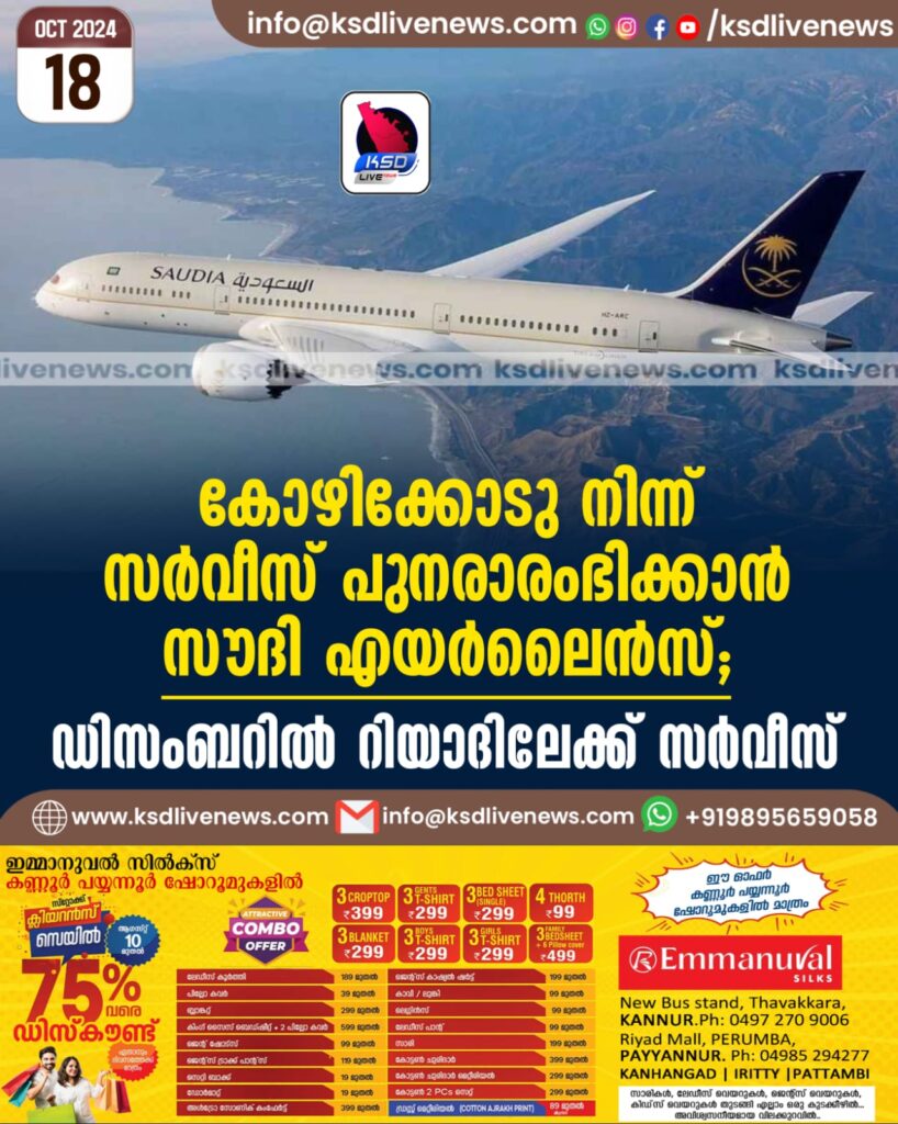 കോഴിക്കോടുനിന്ന് സര്വീസ് പുനരാരംഭിക്കാൻ സൗദി എയര്ലൈൻസ്; ഡിസംബറില് റിയാദിലേക്ക് സര്വീസ്