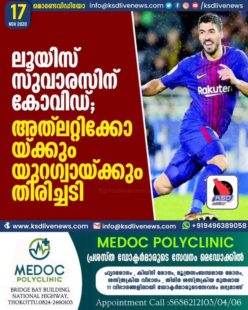 ലൂയിസ് സുവാരസിന് കോവിഡ്; അത്ലറ്റിക്കോയ്ക്കും യുറഗ്വായ്ക്കും തിരിച്ചടി